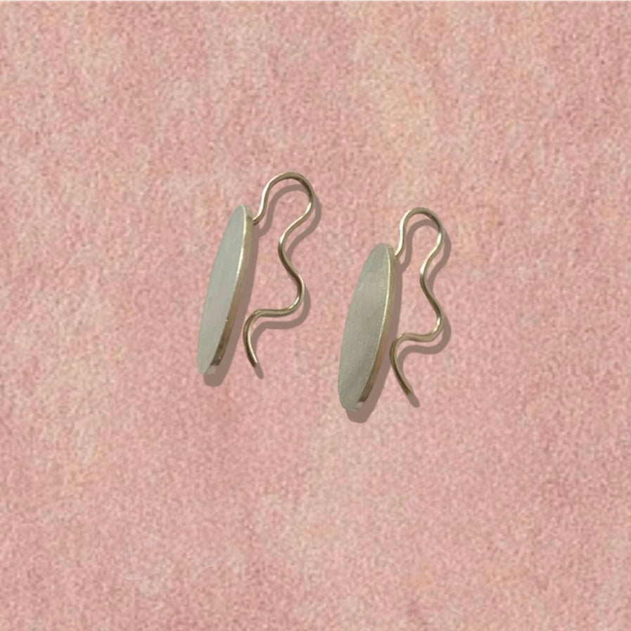 These sterling silver earrings strike a perfect balance between minimalism and whimsy. Featuring a graceful wavy hanger paired with an oval-shaped silver piece, they offer movement and playful elegance in one thoughtful design.